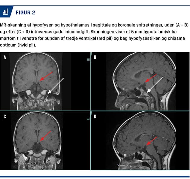 Ved CPP er 90% af alle tilfælde idiopatiske (Figur 1) [16]. Hos piger < 4 år er hypotalamisk hamartom imidlertid den hyppigste årsag til CPP (Figur 2) [1, 16]. Det er en nonneoplastisk kongenit tumor, som kan være associeret med gelastiske anfald og psykomotorisk forsinkelse [16, 17]. Andre tumorer i centralnervesystemet (CNS), anatomiske forandringer og inflammatoriske årsager kan også ses. Reaktivering af hypothalamus-hypofyse-gonadeaksen sker ved pubertetens indtræden via et komplekst netværk af gener, neurotransmittorer og neuronale interaktioner i hypothalamus [2]. Der er på hypotalamisk niveau identificeret flere genetiske markører, som spiller en rolle [18-20]. Mutationer i kisspeptin og dennes receptor (KISS1 og KISS1R) kan medføre øget pulsativ frigivelse af GnRH i hypothalamus, hvilket er påvist i familiære tilfælde af PP [18].