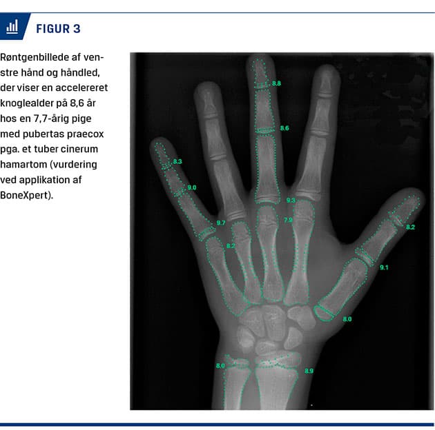 Der laves røntgenoptagelse af venstre hånd for knoglealderbestemmelse (BA) (Figur 3). Ved PP er BA typisk avanceret i forhold til den kronologiske alder pga. epifysernes følsomhed for østrogen [9]. Der tages blodprøver (Tabel 1). Ved mistanke om CPP udføres der en stimulationstest med GnRH-test [2, 16]. Små piger < 3 år har højere stimulerede LH-værdier helt op til 9,2 IE/l end større piger pga. minipuberteten [28]. LH-FSH-ratio er derimod ikke aldersafhængig. Ultralydskanning af genitalia interna er brugbar som led i udredningen, da vækst af uterus og ovarier sker forud for udviklingen af sekundære kønskarakteristika [12]. Hvis undersøgelserne bekræfter CPP, skal der udføres MR-skanning af cerebrum med fokus på hypothalamus og hypofyselejet [10]. I et dansk studie med 208 piger med tidlig pubertet eller CPP uden CNS-symptomer sås der abnorme fund på MR-skanning af cerebrum hos 33 (15,9%) [29]. Hos 13 vurderedes MR-skanningsforandringerne at være den udløsende årsag, hvorimod forandringerne i 20 tilfælde blev betragtet som tilfældige fund. Derfor er undersøgelse altid nødvendig.