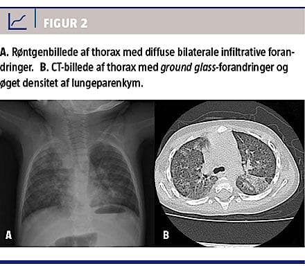Da pigen var 20 måneder gammel, tilkom der tre episoder med hæmoptyse og gentagne fald i hæmoglobinniveauet, og vækstkurven var vigende (Figur 1). En røntgenundersøgelse af thorax viste bilaterale diffuse infiltrative forandringer og tilsvarende ground glass-forandringer på CT (Figur 2). Bronkoskopi og bronkoalveolær lavage (BAL) viste normal anatomi uden makroskopisk blødning. I BAL-væsken påvistes der Streptococcus pneumoniae, Haemophilus influenzae, rhino- og bocavirus samt hæmosiderinholdige makrofager. Lungebiopsi fravalgtes, idet diagnosen IPH blev stillet på baggrund af karakteristiske radiologiske forandringer, hæmoptyse, recidiverende anæmi, hæmosiderinholdige makrofager i BAL og uden andre tegn på systemsygdom.