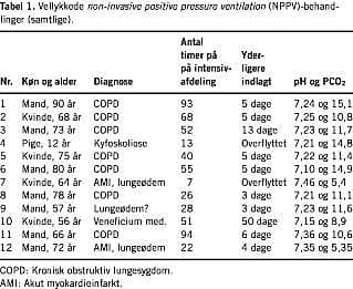 I engelske guidelines anser man behandlingen for specielt velegnet til COPD-patienter med pH mellem 7,25 og 7,35 [14]. Sidste pH-værdi for vore COPD-patienter (på nær én) var, som det ses af Tabel 1, imidlertid ≤ 7,25 før behandling på intensivafdeling. Vi har således haft gode erfaringer med at tilbyde NPPV til COPD-patienter, der var endog særdeles medtagede af det respiratoriske svigt - med de konstaterede pH-værdier ville hovedparten af disse patienter før eller siden have haft behov for intubation og mekanisk ventilation.