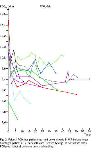 Patient nr. 7 er ikke taget med i figurerne, da hun på intet tidspunkt havde CO2 -ophobning. Det respiratoriske problem her var således iltmætningsfald (SAT -fald) til 88%. Under BiPAP-behandlingen steg denne til 93%.