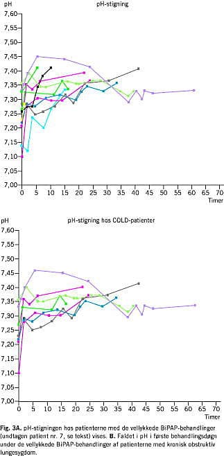 I Fig. 3 B vises, hvor hurtigt stigningen i pH sker for COPD-patienterne. NPPV-behandlingen fortsættes kun til pH er normaliseret, uanset at PCO2 sjældent er normaliseret.