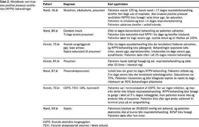 I Tabel 2 refereres kort samtlige sygehistorierne for ikkevellykkede NPPV-behandlinger.