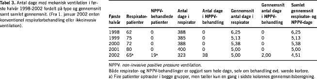 Som det ses af Tabel 3, har indlæggelsestiden i konventionel respirator været faldende (men aldrig under fem dage) i de seneste fem halvår (inkl. 2002), mens NPPV-behandlinger gennemsnitligt kun har varet to dage. Den gennemsnitlige liggetid med mekanisk ventilation (respiratordage + NPPV-dage totalt) er således faldet efter introduktion af NPPV i 2002 fra foregående års gennemsnit på 5 til nu 4,5. Holder denne tendens i andet halvår af 2002, vil vi på årsbasis spare ca. 80 dage med mekanisk ventilation på intensivafdelinger. Da studiet ikke er kontrolleret, kan dette naturligvis skyldes en tilfældighed, men det stemmer overens med de erfaringer, man har gjort i udlandet.