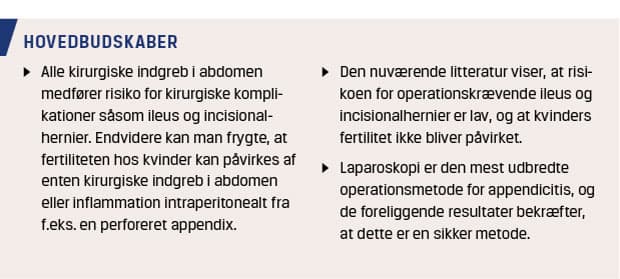 Appendicitis er en udbredt sygdom, som ses både i almen praksis, i akutmodtagelserne og på de kirurgiske afdelinger med mere end 6.000 tilfælde årligt i Danmark [1]. Appendicitis behandles sædvanligvis med laparoskopisk appendektomi og i sjældnere tilfælde med åben operation. Ethvert kirurgisk indgreb medfører risiko for komplikationer på både kort og langt sigt [2, 3]. Der er generelt lav risiko for tidlige komplikationer som sårinfektion og blødning efter appendektomi [4], men der kan hos både patienter og behandlere være en frygt for langtidssequelae i form af ileus, incisionalhernier og nedsat fertilitet [5]. Formålet med denne artikel er derfor at gennemgå disse tre komplikationer på baggrund af den foreliggende litteratur for at give overblik over hyppigheden af ileus og incisionalhernier samt for at afklare, om kvinders fertilitet påvirkes efter appendektomi for akut appendicitis.