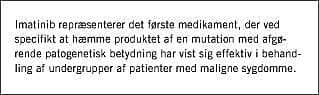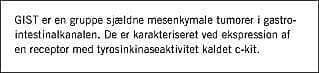 Gastrointestinale stromale tumorer (GIST) er sjældne, gastrointestinale, mesenkymale tumorer, der er karakteriseret ved ekspression af en receptor med tyrosinkinaseaktivitet, kaldet c-kit. Et nyt lægemiddel, imatinib, er en potent hæmmer af en undergruppe af tyrosinkinasefamilien omfattende BCR-ABL, platelet-derived growth factor og c-kit. Imatinib repræsenterer den første systemiske behandling med en klinisk effekt hos patienter med metastaserende, inoperable GIST, der notorisk er behandlingsrefraktære over for kemo- og stråleterapi. I de første fase I- og fase II-undersøgelser er der opnået partielt respons hos henholdsvis 53% og 59% af patienterne.