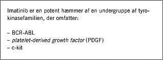 Ud fra kendskabet til patogenesen ved CML, er der udviklet en selektiv, syntetisk tyrosinkinaseinhibitor under navnet »signal transduction inhibitor 571« (STI571) eller imatinib, der administreres peroralt som tabletter. Imatinib er en potent hæmmer af en undergruppe af tyrosinkinasefamilien, der både omfatter BCR-ABL, PDGF (platelet-derived growth factor) og c-kit. Imatinib har en betydelig, klinisk effekt på patienter med interferon-resistent CML i kronisk fase [13, 14].