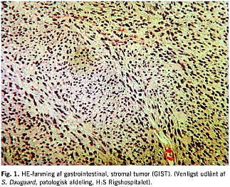 Mikroskopisk (Fig. 1 ) består tumorerne af spindelceller (70%) eller epiteloide celler (30%) med en heterogen morfologi, der gør dem vanskelige at adskille fra de leiomyomatøse tumorer. Tumorerne kan både være udifferentierede, udvise neural differentiering eller differentiering til glat muskulatur, hvilket indicerer, at GIST muligvis udvikles fra multipotente stamceller [5].