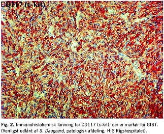 Immunohistokemi spiller en afgørende rolle for identifikationen af GIST: GIST er ofte positiv for det hæmatopoetiske stamcelleantigen, CD34 (70-80%) [7]. Derudover udtrykker cellerne i GIST en vækstfaktorreceptor med tyrosinkinaseaktivitet, kaldet c-kit, der kan detekteres ved immunohistokemisk farvning for CD117 (Fig. 2 ). Dette er det mest specifikke, diagnostiske kriterium for GIST, da næsten 100% af tumorerne er positive for c-kit [8]. C-kit-positivitet i sig selv er dog ikke diagnostisk for GIST, idet c-kit også udtrykkes i f.eks. malignt melanom, neuroblastom, seminom, småcellet lungecancer, visse andre sarkomer samt ovarie- og brystcancer. Derimod er de leiomyomatøse tumorer immunohistokemisk negative for c-kit og kraftigt positive for actin og/eller desmin, mens GIST er negativ for disse. Modsat Schwannoma er GIST samtidig negativ for neuromarkøren S-100. En GIST defineres således i dag som en c-kit-positiv, stromal tumor, der ofte er positiv for CD34, negativ (eller kun fokal positiv) for actin, desmin og S-100, og hvor klinik og morfologi er forenelig med GIST. Interstitielle Cajal-celler (ICC), der danner et muskulært, autonomt pacemakersystem i tarmvæggen og kontrollerer tarmens motilitet, er også fundet positive for c-kit, hvorfor man har foreslået slægtskab mellem ICC og GIST [9].