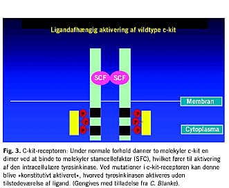 Tyrosinkinaser spiller en afgørende rolle i transduktionen af biokemiske signaler, der er vigtige for reguleringen af cellens vækst, proliferation og funktion. CD117 er c-kit-receptoren, en transmembran vækstfaktorreceptor med tyrosinkinaseaktivitet. Liganden for c-kit-receptoren er stamcelle-faktoren (SCF) [10]. Selve c-kit-receptoren er produktet af proto-onkogenet c-kit, der sidder på kromosom 4q11-12. Formentlig er det mutationer i c-kit, der spiller en hovedrolle i patogenesen til GIST [11]. Under normale forhold danner to molekyler c-kit en dimer ved at binde to molekyler SCF, hvilket fører til aktivering af den intracellulære tyrosinkinase (Fig. 3 ). Tyrosin i c-kitautofosforyleres, og c-kit associeres med substrater, som overfører signaler til celleproliferation og -differentiering. Opstår der mutationer i proto-onkogenet c-kit, vil den muterede c-kit-receptor ofte ændre funktion og blive »konstitutivt aktiveret«, hvilket betyder, at tyrosinkinasen aktiveres uden tilstedeværelse af ligand. Dette fører til dysreguleret celledifferentiering og -proliferation, hvorved der induceres en malign transformation af cellerne [11]. I GIST finder man hyppigt disse konstitutivt aktiverende mutationer i exon 11 (eller sjældnere exon 9 og 13) i c-kit-genet. Mutationerne findes fortrinsvis i maligne GIST, men det er ikke eneste mekanisme, der er relateret til malignitet [12]. Det er formentlig den muterede c-kit, der giver anledning til følsomhed for behandling med imatinib.