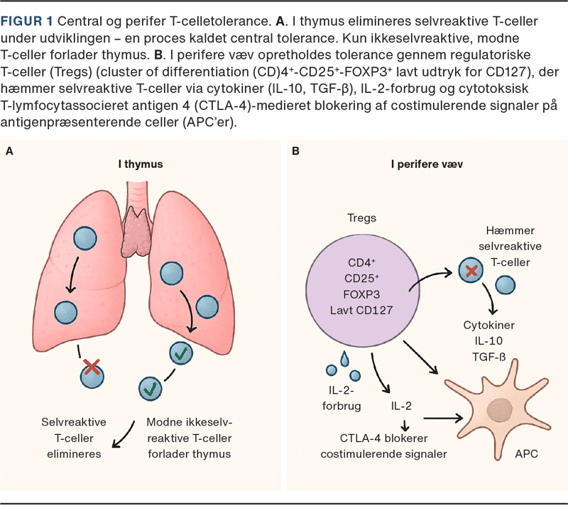 Årets Nobelpris i fysiologi eller medicin går til forskere, der har afsløret immunforsvarets egen bremsemekanisme – regulatoriske T-celler (Tregs): Shimon Sakaguchi fra Japan og Mary E. Brunkow og Frederick J. Ramsdell fra USA [1]. Deres banebrydende opdagelser inden for perifer immunologisk tolerance har haft fundamental betydning for forståelsen af centrale patofysiologiske processer ved autoimmune og maligne sygdomme. Prisen anerkender det afgørende gennembrud med identifikationen af Tregs og klarlægningen af det centrale gen, der styrer deres funktion. Prismodtagerne udfordrede det daværende dogme om, at immunologisk tolerance – evnen til at skelne »selv« fra »ikkeselv« – udelukkende etableres i thymus via den såkaldte centrale tolerance (Figur 1). De påviste, at et aktivt perifert tolerancesystem kontinuerligt vedligeholder selvtolerance gennem hele livet. Opdagelsen genoplivede den tidligere forkastede idé om »suppressor-T-celler« fra 1970’erne og har banet vejen for nye tolerancefremmende terapier, som nu testes klinisk.