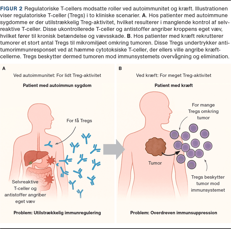Opdagelsen har tydeliggjort Tregs’ dobbelte kliniske rolle (Figur 2) [6]. Ved autoimmune sygdomme og transplantation fungerer de som afgørende allierede: Et utilstrækkeligt antal eller nedsat funktion bidrager til sygdomme som multipel sklerose, leddegigt og systemisk lupus erythematosus. Behandlingsstrategier søger derfor at genoprette tolerance – f.eks. gennem udvidelse og reinfusion af Tregs dyrket uden for kroppen. De første kliniske forsøg ved type 1-diabetes, systemisk lupus erythematosus og transplantation viser, at Treg-terapi er sikker og kan fremme antigenspecifik tolerance uden generel immunsuppression.