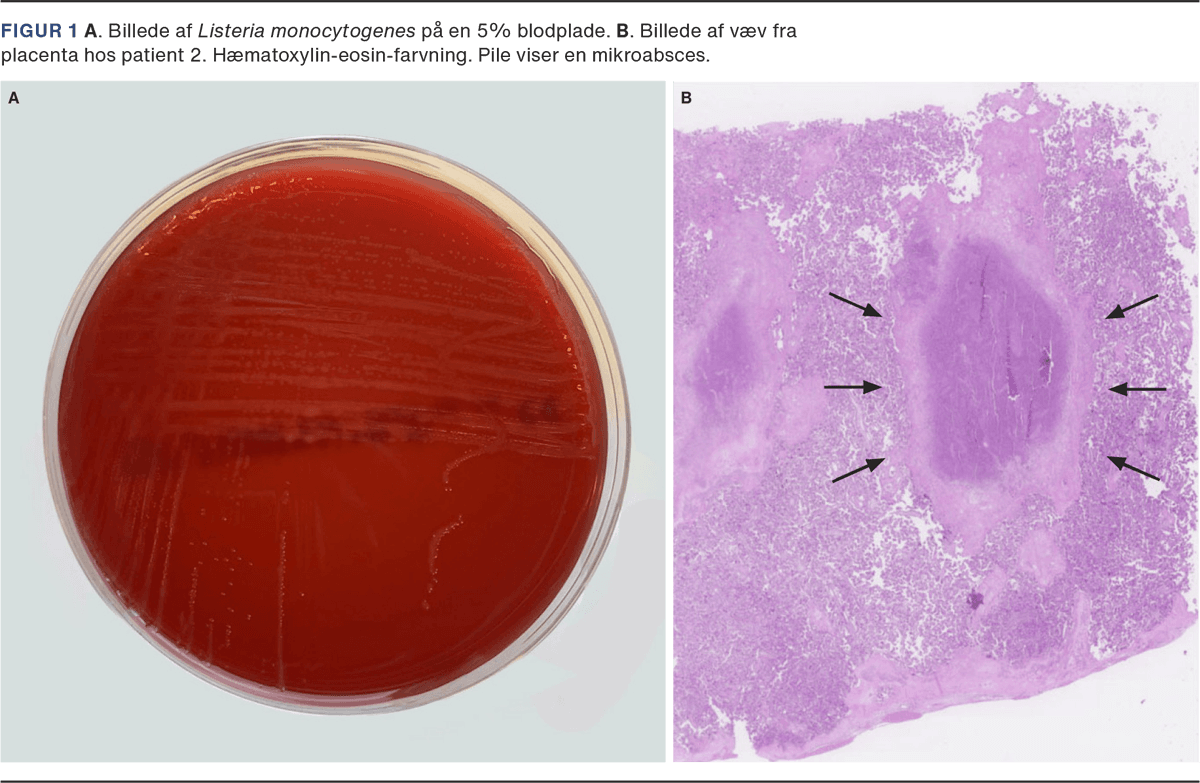 Hos begge patienter var placenta uden synlige forandringer og blev sendt til patologisk undersøgelse med fund af mikroabscesser forenelige med listeriainfektion (Figur 1 B). Ved PCR fra væv omkring abscesserne fandt man DNA fra L. monocytogenes hos begge.