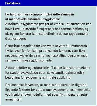 Det kan ikke forventes, at man ud fra studier af dyremodeller med specifikt induceret autoimmunitet kan afklare alle tilgrundliggende faktorer for autoimmunsygdomme hos mennesker. Dyremodeller er relativt enkle manifesta-tioner af menneskets komplekse sygdomsprocesser, er ofte udført på selektiv genetisk baggrund (indavlede dyr) og er i reglen tilvejebragt på basis af (formodet) viden om en eller få patogenetiske mekanismer ved den sygdom, man ønsker at udforske.