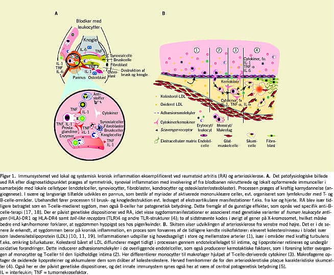 Historisk set har udforskningen af immuninflammatoriske processer især inddraget studier af det adaptive immunsystem med fokus på MHC- T- og B-celleinteraktioner og antistoffer. Selv om dette har fejret triumfer ved bekæmpelsen af flere infektionssygdomme (vaccination), har disse studier kun i begrænset omfang ledt til nye og effektive strategier for behandling af kroniske inflammatoriske sygdomme (Tabel 1). Der er flere årsager til dette herunder en mangelfuld interesse for udforskning af det innate immunsystems rolle ved autoimmunsygdomme. Den centrale betydning af visse cytokiner ved disse lidelser er for eksempel først blevet åbenbar i de seneste år takket være spektakulære behandlingsresultater med biologiske lægemidler, der er rettet mod visse cytokiner [12, 13]. Den patogenetiske betydning af celler, som normalt ikke regnes for betændelsesceller, har også været negligeret [14-16]. Det drejer sig f.eks. om involvering af fibroblaster, synoviocytter samt brusk- og knogleceller ved inflammatoriske ledsygdomme og endotel- og glatmuskelceller ved arterios klerose og vaskulitissygdomme (Figur 1). Endelig har immunologien lidt under hypoteser, som er blevet omfattet med for stor autoritet gennem (for) lang tid, og omvendt hypoteser, som er blevet forkastet på utilstrækkeligt grundlag. Illustrative eksempler er den såkaldte T-hjælper (Th)1/Th2-hypotese og begrebet suppressor-T-celler.