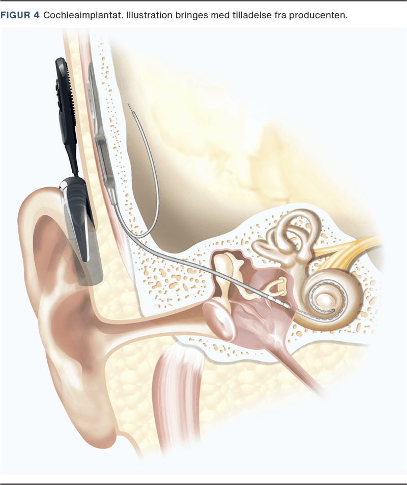 Ved svær eller meget svær hørenedsættelse og forringet taleforståelse trods bedst mulig høreapparatbehandling kan behandling med cochleaimplantat (CI) være indiceret. CI betragtes som en af historiens største medicinsk-teknologiske landvindinger, hvor det er lykkedes at gøre døve hørende. Det blev udviklet i 1960’erne og er nu et standardtilbud ved medfødt eller erhvervet svær hørenedsættelse, og sammenlignet med brug af HA vil et implantat forbedre hørelse, auditiv-verbal kommunikation og livskvalitet [17-19]. Lyden i et CI er i et vist omfang forskellig fra den naturlige lyd, hvorfor der i modsætning til HA og BAHS, skal betydelig genoptræning til.