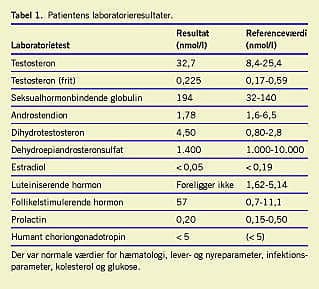 Efter ni måneders behandling fik patienten erektiv impotens. Libido var bevaret, og genitalia externa var upåfaldende, dog var patienten højresidig orkiektomeret for 26 år siden pga. et inkarcereret ingvinalhernie. Hårvæksten var normal, og der var ingen gynækomasti. MTX blev forsøgsvis seponeret, og i løbet af 1-2 uger forsvandt potensproblemerne fuldstændigt. Ved reeksponering en måned senere med 10 mg × 1 ugentligt recidiverede patientens potensproblemer efter ca. to måneder, hvorfor han ønskede at ophøre med MTX, og han påbegyndte behandling med azathioprin. Patientens blodprøvesvar (11/2 år efter påbegyndelse af MTX-behandling) ses i Tabel 1 .