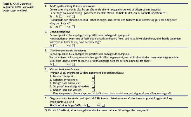 Delirium hos ældre patienter er beskrevet med en incidens på op til 60% [3]. Variationen i incidensen af delirium kunne tyde på, at der er tale om et overset og negligeret fænomen, eller tages som udtryk for, at der er diagnostiske vanskeligheder [2-4]. Til dette formål er der udviklet diverse måleskalaer, hvor confusion assessment method (CAM)-score er den mest udbredte og bedst dokumenterede [5] (Tabel 1 ).