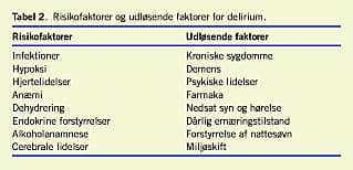 De geriatriske patienter udgør en særlig risikogruppe for at få delirium. Ældre har ofte en eller flere kroniske sygdomme og har dermed risiko for polyfarmaci og lægemiddelinteraktioner. Aldersbetingede ændringer i farmakokinetikken, især reduceret renal ekskretion, og i mindre grad hepatisk elimination gør denne patientgruppe særlig følsom over for medicinpåvirkninger. Særligt antikolinerge stoffer, sedativa og stærke analgetika forbindes med delirium. Risikofaktorer og udløsende faktorer ses i Tabel 2 . Ætiologien er typisk multifaktoriel [2, 6-10].