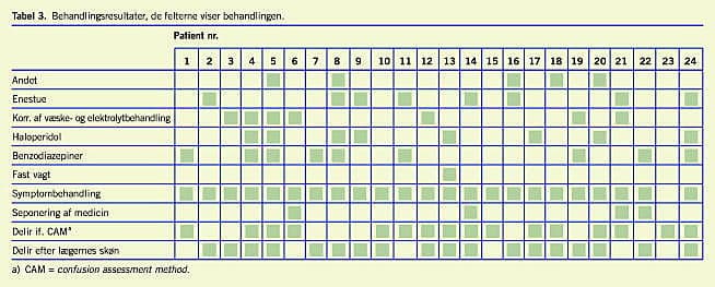 Af de 24 patienter, der fik deliriumdiagnosen, fik 23 symptomatisk behandling, dvs. behandling for indlæggelsesdiagnosen (f.eks. antibiotika for pneumoni), syv fik korrektion af elektrolyt- og væskebalance, fire fik seponeret medicin, otte fik haloperidol, en fik olanzapin, en fik risperidon, ni fik benzodiazepiner (heraf fik to stesolid), en blev overflyttet til psykiatrisk afdeling, syv var på enestue, og en fik fast vagt (Tabel 3).