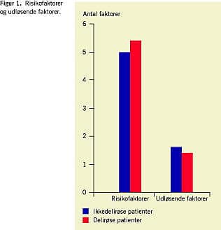 De delirøse patienter (n = 16) havde gennemsnitligt 5,4 risikofaktorer, og de ikkedelirøse patienter havde gennemsnitligt 5 risikofaktorer (Figur 1 ), hvilket ikke var signifikant forskelligt (p = 0,09). Antallet af udløsende faktorer hos ikkedelirøse patienter og delirøse patienter var hhv. 1,6 og 1,4, hvilket ikke er signifikant forskelligt (p = 0,6) (Figur 1). Sammenlignes alder (hhv. 84,4 år og 83,7 år) og antal anvendte præparater (hhv. 5,5 og 6,1) ses igen ingen signifikant forskel mellem de to grupper (p = 0,65) og (p = 0,39).