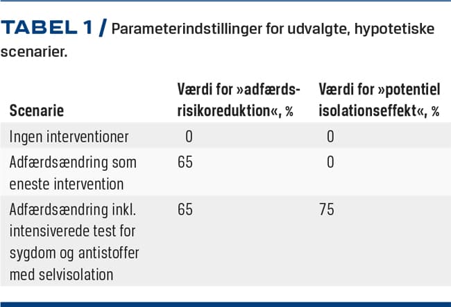 Med den udviklede model kan man nu teste effekten af hypotetiske interventioner. I simuleringsmodellen ændres kun på parametrene »adfærdsrisikoreduktion« og »potentiel isolationseffekt«. Følgende scenarier afprøves (Tabel 1).
