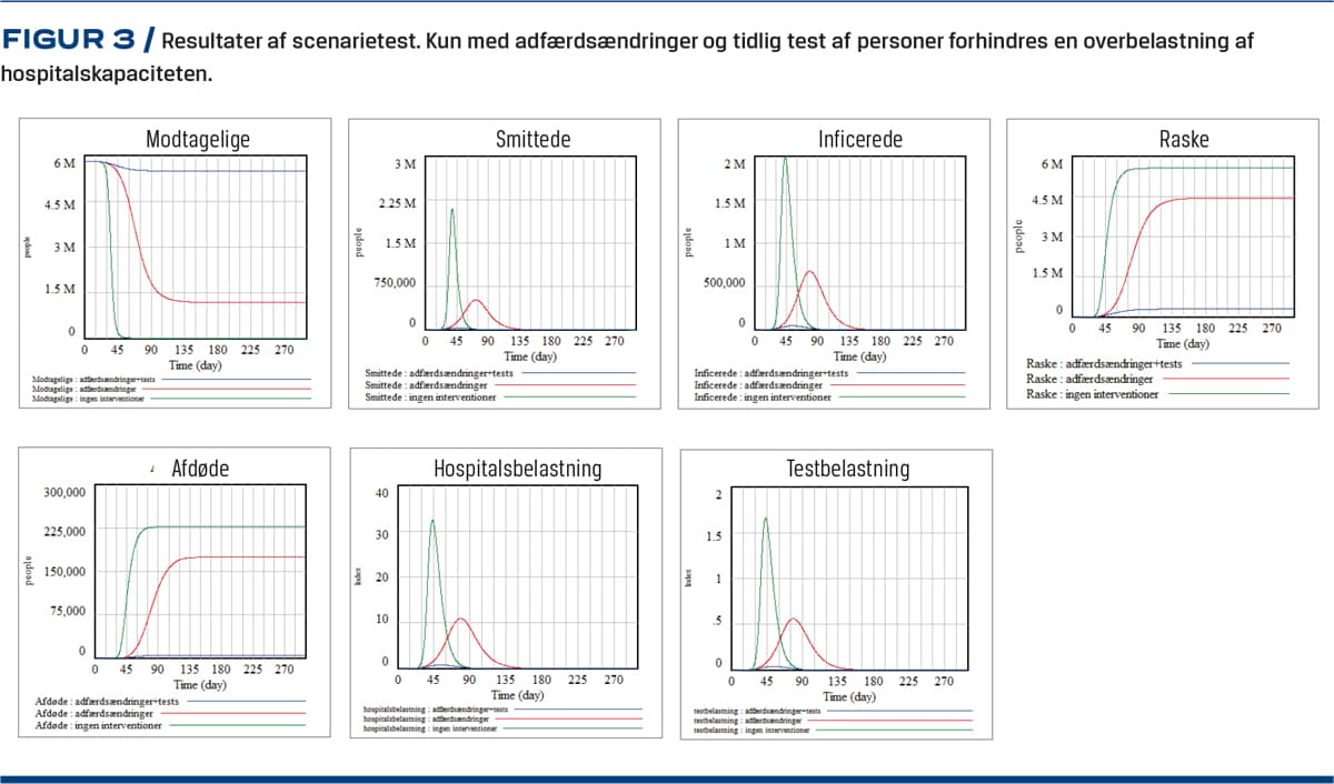 Resultaterne afspejles i antallet af modtagelige, smittede, inficerede, raske og døde samt belastningen på henholdsvis hospital- og testkapacitet (Figur 3).