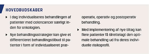 Behandlinger kan individualiseres i forhold til patientens særlige risikoprofil, molekylærbiologiske karakteristika og debutsymptomer. Artiklens formål er kort at introducere den individualiserede behandling, der findes i dag, samt nævne nogle af de områder, der er under udvikling, og som muligvis kan give nye behandlingstilbud til patienter med sporadisk coloncancer.