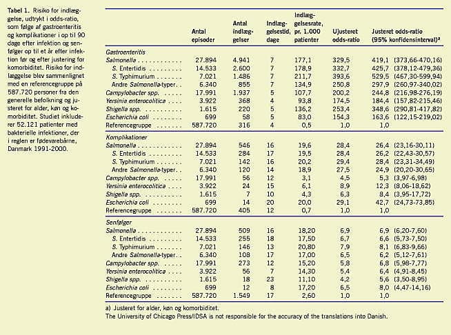 Der var stor forskel i indlæggelseshyppigheden afhængigt af species: 17,7% af Salmonella- patienterne blev indlagt sammenlignet med 10,8% af Campylobacter- patienterne. Tabel 1 viser antallet af indlæggelser og indlæggelsestid fordelt på species og Salmonella- serotype. Tabellen viser også den relative risiko for indlæggelse udtrykt i odds-ratio (OR) før og efter justering for komorbiditet. Indlæggelsestiden relateret til gastroenteritis var 4-7 dage afhængigt af patogen. For patienter med en komplikationsdiagnose varierede indlæggelsestiden fra ti dage hos Yersinia- patienter til 20 dage hos patienter med E. coli. HUS var den vigtigste indlæggelsesårsag blandt sidstnævnte og associeret med lang indlæggelsestid (21 dage). Salmonella- infektion var forbundet med en seks gange højere risiko for indlæggelse med en ekstraintestinal komplikation (OR: 30,3, 95% konfidensinterval (KI): 26,2-35,1, sammenlignet med baggrundsbefolkningen) end Campylobacter- infektion (OR: 4,9, 95% KI: 3,5-6,8) (p < 0,001) (data vist i den originale publikation).