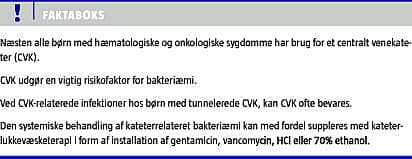 Centrale venekatetre (CVK) er en uundværlig del af behandlingen til kritisk syge børn, herunder børn med hæmatologiske og onkologiske lidelser. Ved anlæggelse af et CVK fås en lettilgængelig og stabil intravenøs adgang. De tunnelerede CVK har endvidere den fordel, at de ofte kan fungere i måneder til år. CVK er imidlertid også en væsentlig risikofaktor for bakteriæmier med deraf følgende morbiditet og mortalitet. Prævalensen af CVK-relaterede infektioner er 1-2 pr. 1.000 CVK-dage [1, 2] men med store variationer afhængigt af katetertype, kateterbrug, placering af katetret og patientens grundsygdom [3]. Patogenesen bag udviklingen af CVK-relaterede infektioner hænger sandsynligvis sammen med den biofilmdannelse, der opstår i katetrene inden for de første uger [4].