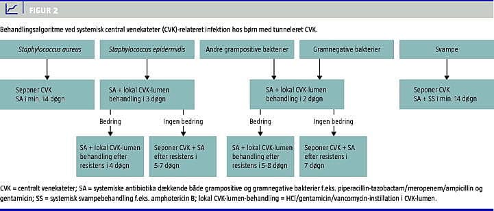 Det anbefales at påbegynde empirisk antibiotisk behandling ved mistanke om CVK-relateret infektion hos børn med neutropeni [6]. I Figur 2 er der givet en behandlingsalgoritme. Den valgte behandling bør omfatte antibiotisk dækning over for både gramnegative og grampositive bakterier. I Danmark vil en antibiotisk behandling ofte omfatte piperacillin-tazobactam, meropenem eller ampicillin kombineret med gentamicin. Ved CVK-relateret infektion forårsaget af S. epidermidis kan CVK ofte bevares, men der ses tilbagevendende infektion i op til 25% af tilfældene [18]. Hvis patientens tilstand forværres under den systemiske behandling, eller hvis der fortsat er positive bloddyrkninger efter 2-3 døgn afhængigt af den pågældende mikroorganisme, anbefales det at seponere CVK. Hos børn tages der dog ofte kun bloddyrkninger centralt, hvilket medfører større diagnostisk usikkerhed med hensyn til diagnostik af CVK-relateret bakteriæmi, end hvis der samtidig tages bloddyrkning fra en perifer vene [8].