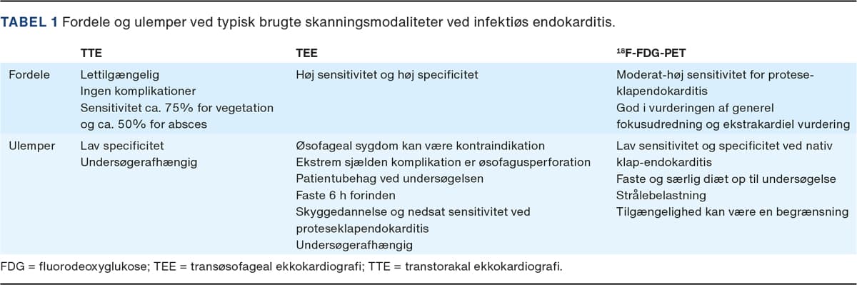 Overordnet set kræver en sikker IE-diagnose, at der både er en IE-typisk bakteriæmi og en billeddannende modalitet suspekt for IE (typisk ekkokardiografi). Tidsforskudte sæt af bloddyrkninger er essentielle for vurdering af graden af bakteriæmi. Dette må gøres med relativt korte tidsintervaller, hvis patienten er akut påvirket. Førstevalg af billeddannende modalitet er ekkokardiografi, hvor transtorakal ekkokardiografi udføres på lav klinisk mistanke. Såfremt der er høj klinisk mistanke (IE-typisk bakteriæmi, feber og hjertesvigt, uafklaret infektion og emboli, feber og mislyd, uafklaret feber), bør der yderligere foretages transøsofageal ekkokardiografi [22]. Diagnostisk udredning suppleres ofte med PET-CT, som er særligt relevant hos patienter, som har hjerteklapprotese eller pace device, og som er mistænkt for IE [22, 24]. Tabel 1 angiver fordele og ulemper ved de typisk brugte skanningsmodaliteter. Ved mistanke om abscesdannelse, især ved proteseklap-IE, er supplerende hjerte-CT ofte værdifuld. Internationale og danske retningslinjer anbefaler, at diagnostik og behandling varetages af et multidisciplinært »endokarditisteam« – f.eks. med deltagelse af kardiolog, thoraxkirurg, klinisk mikrobiolog eller infektionsmediciner [22, 25].