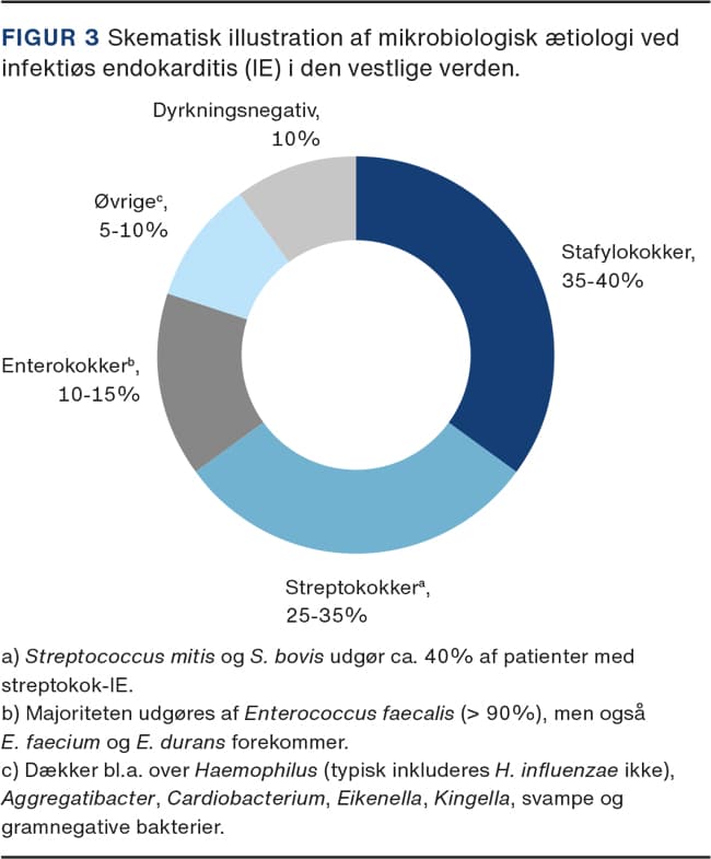 Ætiologien til IE varierer også afhængig af patienten, hvor det f.eks. blandt patienter med proteseklap-IE ses, at S. aureus og E. faecalis er mere prævalente [19]. Patienter med E. faecalis-IE er typisk ældre end patienter med IE med anden mikrobiologisk ætiologi. For både proteseklap- og pacemaker-IE er koagulasenegative stafylokokker betydeligt mere prævalente sammenlignet med nativ klap-IE, og generelt observeres en større variation af mikrobiologiske ætiologier ved implanteret materiale [19-21]. Figur 3 er en skematisk illustration af fordelingen af mikrobiologisk ætiologi ved IE i den vestlige verden.