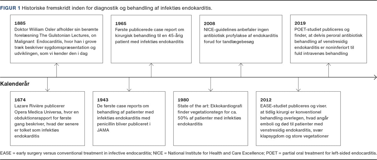 Infektiøs endokarditis (IE) antages at have en dødelighed på 100% uden behandling [1]. Sygdommen har været kendt siden midten af det 19. århundrede, men særligt gennem de seneste 10-20 år er der rapporteret betydelig ændret epidemiologi med samtidig udvikling af både diagnostik og behandling af IE, hvilket er grundlaget for denne statusartikel [2, 3]. Figur 1 opridser nogle af de landvindinger, der er sket igennem tiden. Vi fokuserer på ændringer i den kliniske præsentation og karakteristik af patienter med IE over tid, mens kliniske fund og diagnostisk udredning kun beskrives i mindre grad. Endelig præsenteres nye behandlingsprincipper og perspektiverne af disse.