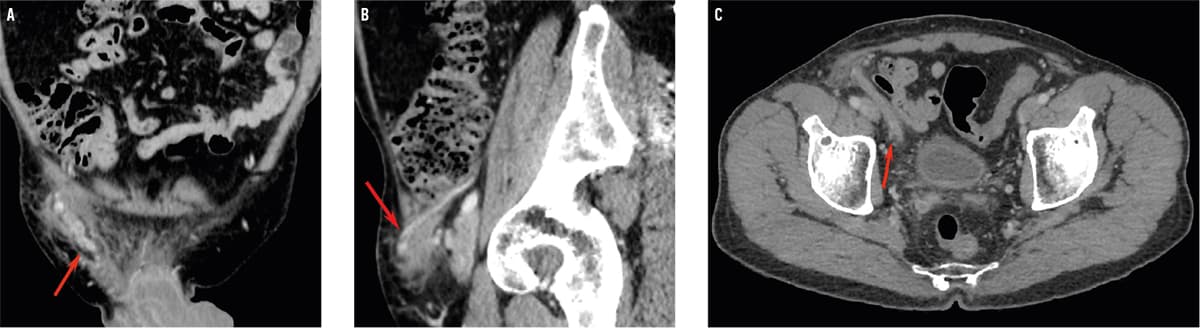 CT-billeder af abdomen med intravenøs kontrast i det koronale (A), sagittale (B) og aksiale (C) plan. Der ses opladning af højre vas deferens i canalis inguinalis med omgivende ødem og bløddelshævelse i lysken (A, B, pil). Vas deferens var dilateret intraabdominalt (C, pil). Der var desuden opladning i højre vesicula seminalis (ej vist).