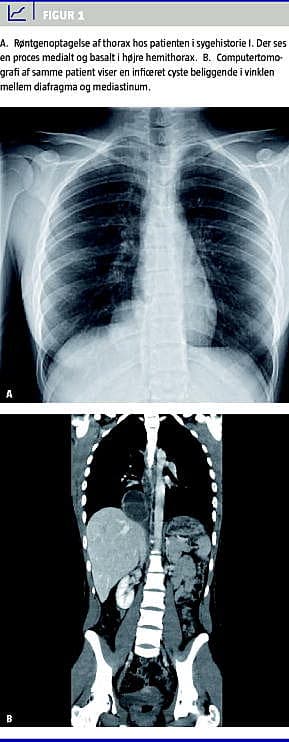 I. En 19 år gammel kvinde blev indlagt på et lokalsygehus pga. smerter i epigastriet, febrilia og dyspnø. Patienten var to år tidligere blevet indlagt med samme symptomer. En eksplorativ laparoskopi, der blev foretaget på mistanke om appendicitis, viste normale forhold. En CT, der blev foretaget ved genindlæggelsen, viste inficeret cyste/absces i mediastinum klos på diafragma ( Figur 1 ). Patienten blev overflyttet til en thoraxkirurgisk afdeling og opereret akut. Ved torakotomi fandt man en stor pusfyldt cyste på 6 cm i diameter indkilet i det nedre lungeligament klos på diafagma og øsofagus. Cysten blev fjernet in toto. Histologisk undersøgelse viste inficeret bronkogen cyste.