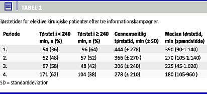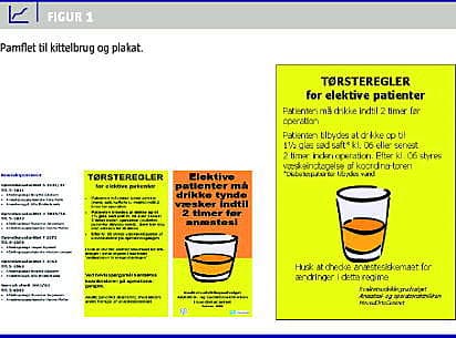 Patienter, der skal opereres, bliver holdt fastende og tørstende for at mindske risikoen for aspiration under anæstesi. Aspiration er en frygtet komplikation, om end sjælden. Den forekommer i en ud af 8.000 an-æstesier hos ASA 1- og 2-patienter [1]. Ventriklen har en tømningshastighed på ca. to timer for tynde væsker og 6-12 timer for komplet tømning [2-4]. Langvarig tørst øger imidlertid risikoen for, at man får symptomer såsom sult, træthed, nedsat koncentration, hovedpine, irritabilitet, dehydrering og hy-poglykæmi. Derudover øges den postoperative insulinresistens, hvilket har en negativ indflydelse på anabolisme og restitution [5, 6]. Dette kan modvirkes ved indtagelse af en sukkerholdig væske to timer før operationen [7]. Ydermere har det en gavnlig effekt på patientkomforten, og den postoperative indlæggelsestid kan reduceres med op til 20% [8]. Dansk Selskab for Anæstesi og Intensivmedicin anbefaler en fastetid på seks timer og en tørstetid for klare væsker på to timer for elektive kirurgiske patienter. Formålet med dette studie var at undersøge, om tørstetiden for elektive kirurgiske patienter blev overholdt. Hvis det ikke var tilfældet, om tørstetiden i så fald kunne påvirkes gennem informationskampagner bestående af information fra foldere, plakater og undervisning rettet mod personalet såvel på stamafdelingen som på anæstesiafdelingen. Hypotesen var, at tørstetiden kunne reduceres gennem informationskampagner.