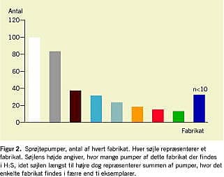 Flertallet af pumperne findes kun i ganske få eksemplarer: ti fabrikater af volumetriske infusionspumper og 13 fabrikater af sprøjtepumper findes i ti eller færre eksemplarer (Figur 1 og Figur 2 ). Af de 919 volumetriske infusionspumper havde 657 (71%) sætbaseret friløbssikring, mens de resterende 262 (29%) havde pumpebaseret friløbssikring. På to af hospitalerne havde ingen af pumperne sætbaseret friløbssikring, og på et hospital havde 616 af 619 pumper sætbaseret friløbssikring.