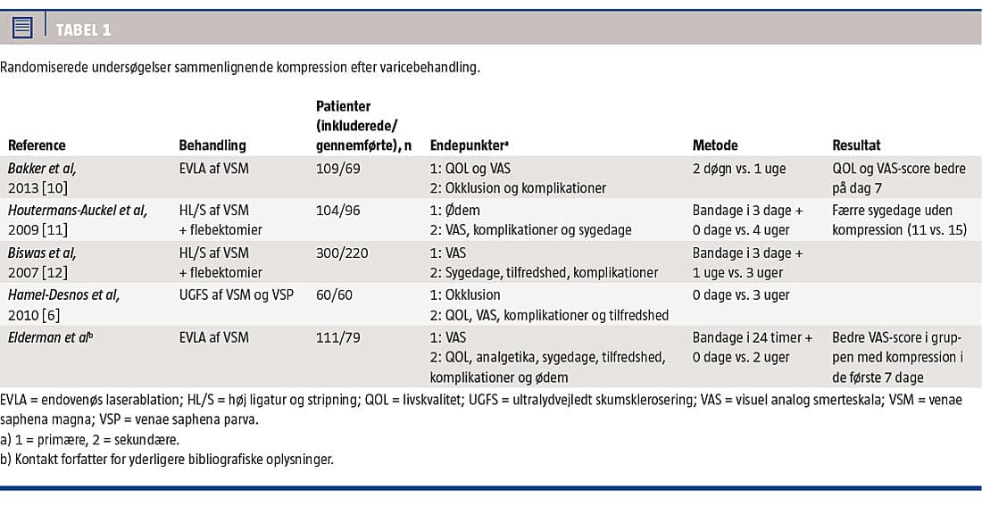 Huang et al [7] undersøgte den optimale varighed af postoperativ kompression efter varicebehandling. Forfatterne fandt frem til fire randomiserede studier, der opfyldte deres krav til inklusion. To af studierne er inkluderet i denne artikel og er dermed beskrevet ovenfor [11, 12]. Forfatterne konkluderede på analysen, at postoperativ kompression i mere end syv dage efter varicebehandling ikke giver større reduktion i postoperativ smerte, komplikationer eller fravær fra arbejde. Det anbefales at indføre kortere varighed som standardrutine. Som kommentar til anbefalingerne erkender forfatterne, at disse er baseret på evidens af lav kvalitet. En mere detaljeret evaluering kræver flere randomiserede studier baseret på standardiserede fremgangsmetoder.
