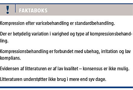 Postoperativ smerte, hæmatomer, ødem og flebitis er almindeligt forekommende komplikationer efter varicebehandling [24]. For at begrænse dette er det i Danmark og mange steder verden over praksis at ordinere kompression efter varicebehandling [4, 5]. Til trods for den omfattende brug af postoperativ kompression er der ikke evidens for effektiviteten. De eksisterende randomiserede studier på området er små og af lav kvalitet. Endvidere er de usammenlignelige, idet de er baseret på forskellige kliniske fremgangsmåder og forskellige typer af kompression.