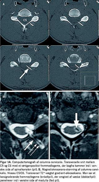 Ved en magnetisk resonans (MR)-skanning af columna cervicalis blev der påvist et ikkemetallisk fremmedlegeme, ekstra- og intraduralt, penetrerende venstre side af medulla på niveau C5/C6. Fremmedlegemet var omgivet af væske. En computertomografi (CT) (og røntgenundersøgelse - ikke vist), der blev udført for nærmere karakteristik af arten af fremmedlegemet, tydede på, at det bestod af plastik (Figur 1A og B).