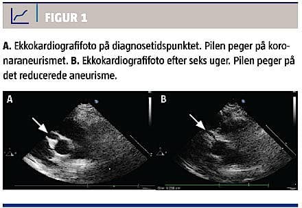 Patienten blev behandlet med i.v. givet immunglobulin (IVIG) og aspirin. En ekkokardiografi viste et 4,3 mm stort fussiformt aneurisme på højre koronararterie (Figur 1A). Seks uger efter behandlingsstart var aneurismet reduceret til 2,6 mm (Figur 1B). Efter fem måneder var det yderligere reduceret til 1,9 mm, og aspirinbehandlingen blev seponeret. Efter et år var der ingen koronaraneurismer ved ekkokardiografi.
