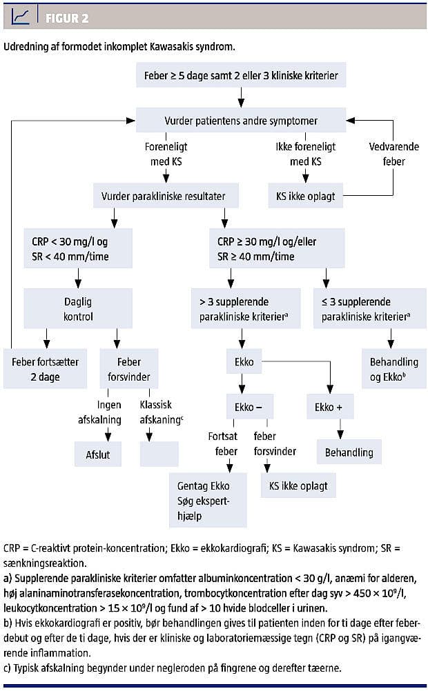 Både lav alder, < 6 måneder, og inkomplet KS er risikofaktorer for sen diagnosticering af KS [3]. Tilsvarende har samme aldersgruppe øget risiko for at få koronaraneurismer [3]. I 2004 publicerede American Heart Association en algoritme til diagnosticering og behandling af KS [4], hvilket resulterede i bl.a. kortere udredningstid af inkomplet KS (Figur 2) [5]. Hurtig igangsætning af behandling er vigtig, da risikoen for koronaraneurismer reduceres til en femtedel, hvis IVIG bliver givet før tiendedag med febrilia [1].