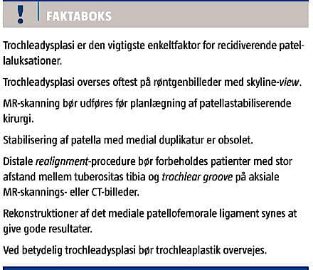 chleabrusken, og trochlea lateraliseres 5-10 mm, hvorved TT-TG-afstanden reduceres tilsvarende [28]. Det genskaber anatomien i videst mulig omfang, således at en ny fure til patella etableres, og der opnås ossøs stabilitet (Figur 3). I seneste studier har man suppleret teknikken med rekonstruktion af det mediale patellofemorale ligament, som bidrager med stabilitet ved ekstension [29, 30]. Resultaterne fra knap 20 caseserier har vist gode resultater med reluksationsrater tæt på nul, og der er ikke rapporter om manglende heling af brusken i trochlea. Operationen har hidtil været udført som åben kirurgi, men der er nu udviklet en mere skånsom artroskopisk teknik med reduceret morbiditet [29].