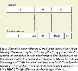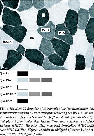 Traditionelt er inddelingen af muskelfibre i forskellige klasser sket på baggrund af fibrenes individuelle kontraktionsegenskaber, histokemiske ATPase-farvninger og forskellige enzymmarkører for henholdsvis aerob og anaerob metabolisme (Fig. 1). Baseret på dette inddeles muskelfibre almindeligvis i type I-fibre, som er karakteriseret ved at være makroskopisk røde, svært udtrættelige og slow-twitch-oxidative, type IIa-fibre som er makroskopisk røde og fast-twitch-oxidativ-glykolytiske (en intermediær muskelfiber) og endelig i type IIx-fibre (tidligere benævnt IIb-fibre, disse findes også i specielle muskler hos mennesket som fx i øjet og i larynxmusklerne), som er makroskopisk hvide og har en fast-twitch-glykolytisk fænotype (1). Det er velkendt, at røde muskelfibre har et stort myoglobinindhold og et stort mitokondrieantal og samtidig besidder en stor oxidativ kapacitet mht. forbrænding af fedtsyrer og glukose. I modsætning hertil har hvide muskelfibre et lavere oxidativt potentiale. Endelig varierer insulinfølsomheden hos de tre hovedtyper af muskelfibre. Type I-fibre er kendetegnet ved den højeste insulinfølsomhed, type IIa-fibre er intermediære, og type IIx-fibre er karakteriseret ved den laveste insulinfølsomhed. De metaboliske egenskaber for de enkelte fibre er påvirkelige af fysisk aktivitet og kan variere afhængig af, hvilken muskel der undersøges, men oversigtsmæssigt er fibrene karakteriseret som beskrevet.