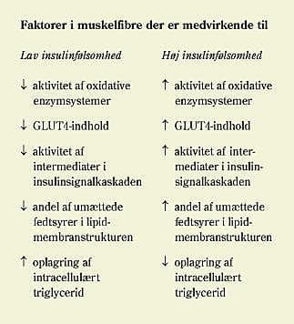 Den intramuskulære ophobning af lipider i form af triacylglyceroler har en klar korrelation til insulinvirkningen i muskulaturen og er i nogle studier vist i højere grad at være bestemmende for den perifere insulinfølsomhed end andre mål for overvægt (BMI, hofte-talje-ratio etc.). Oplagring af triglycerid i muskelceller er øget hos personer med adipositas og type 2-diabetes samt hos raske førstegradsslægtninge til personer med type 2-diabetes og er korreleret til graden af insulinresistens. Årsagen kunne være en nedsat oxidativ evne og have baggrund i reduceret mitokondrieindhold eller -funktion i muskulaturen (11). Formentlig skyldes den reducerede insulinfølsomhed og oxidative evne samt øgningen af triglyceridindholdet hos personer med type 2-diabetes og adipositas ændringer inden for hver fibertype og ikke i så høj grad ændringer i fibertypefordelingen (5).
