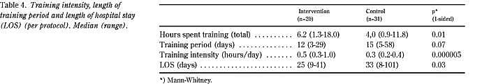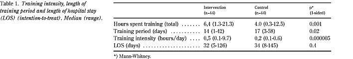 Ved intention-to-treat-analyse af alle randomiserede patienter (Tabel 1) fandtes træningsperiodens varighed signifikant kortere, mens træningsmængden (totalt antal træningstimer) og træningsintensiteten (antal træni ngstimer/dag) var signifikant større i interventionsgruppen end i kontrolgruppen. Indlæggelsesvarigheden var identisk i de to grupper.
