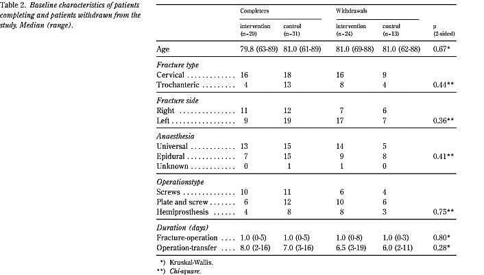 Frafaldet i kontrolgruppen skyldtes især manglende optræningsmuligheder pga. frakturkomplikationer (bl.a. caputnekrose hos to patienter), almen svækkelse og dårlig kooperation.
