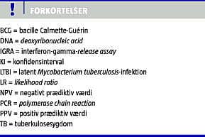 Aktiv Mycobacterium tuberculosis -infektion (TB) kan ubehandlet have dødelig udgang, og med en udpræget rejseaktivitet blandt danske borgere og en etnisk blandet befolkning er den diagnostiske bekræftelse og afkræftelse af TB fortsat en hyppig tilbagevendende klinisk problematik på alle danske akutmedicinske afdelinger, selvom Danmark er at betragte som et lavincidens område for TB. Indtil nu har konventionel diagnostisk verificering af TB indbefattet mikroskopi og dyrkning af relevant materiale samt muligheden for bioteknologisk DNA-diagnostik ved polymerase chain reaction (PCR) [1-3]. Siden 2004 har muligheden for en forbedret og mere specifik påvisning af cellulær immunaktivering over for M. tuberculosis ved såkaldt interferon-gamma-releaseassay (IGRA) været kommercielt tilgængelig i Danmark, og i internationale retningslinjer anbefales benyttelsen af IGRA til diagnostik af latent (inaktiv) M. tuberculosis -infektion (LTBI), men ikke til aktiv TB-sygdom [3, 4]. De nyeste danske retningslinjer for TB-diagnostik og -smitteopsporing er fra før fremkomsten af IGRA og anfører brugen af den klassiske Mantouxtest til formålet at sandsynliggøre LTBI ved kontaktopsporing af nylig smitte med M. tuberculosis [1, 2], mens nyere danske retningslinjer for immunsuprimerede patienter nævner den mulige fremtidige benyttelse af IGRA til samme formål [5]. En positiv immunaktiveringstest (IGRA eller Mantoux) kan ikke skelne den aktive TB-sygdom fra LTBI, der på livstidsbasis hos 5-10% af personerne progredierer til TB [3, 6].