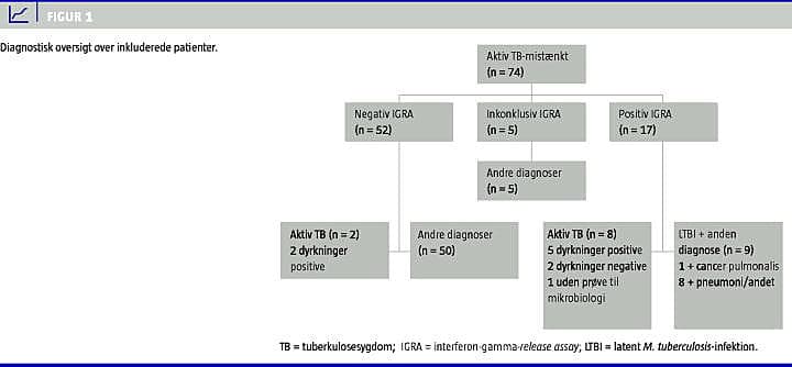 IGRA var positiv hos 17 patienter (23%), og aktiv TB-sygdom blev diagnosticeret blandt otte af de 17 patienter (samt to TB-patienter med negativ IGRA). Ud af de ni patienter med LTBI (hvor IGRA var positiv) havde en patient uerkendt lungecancer med initialt negativ PCR, mikroskopi og senere også dyrkning af ventrikel-skyllevæske, men bronkoskopisk diagnostik blev iværksat 3,5 måneder senere ved fund af radiologisk progression trods regelret antituberkuløs behandling. De øvrige otte patienter med LTBI havde pneumoni eller anden samtidig sygdom.
